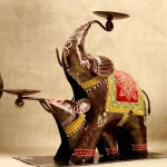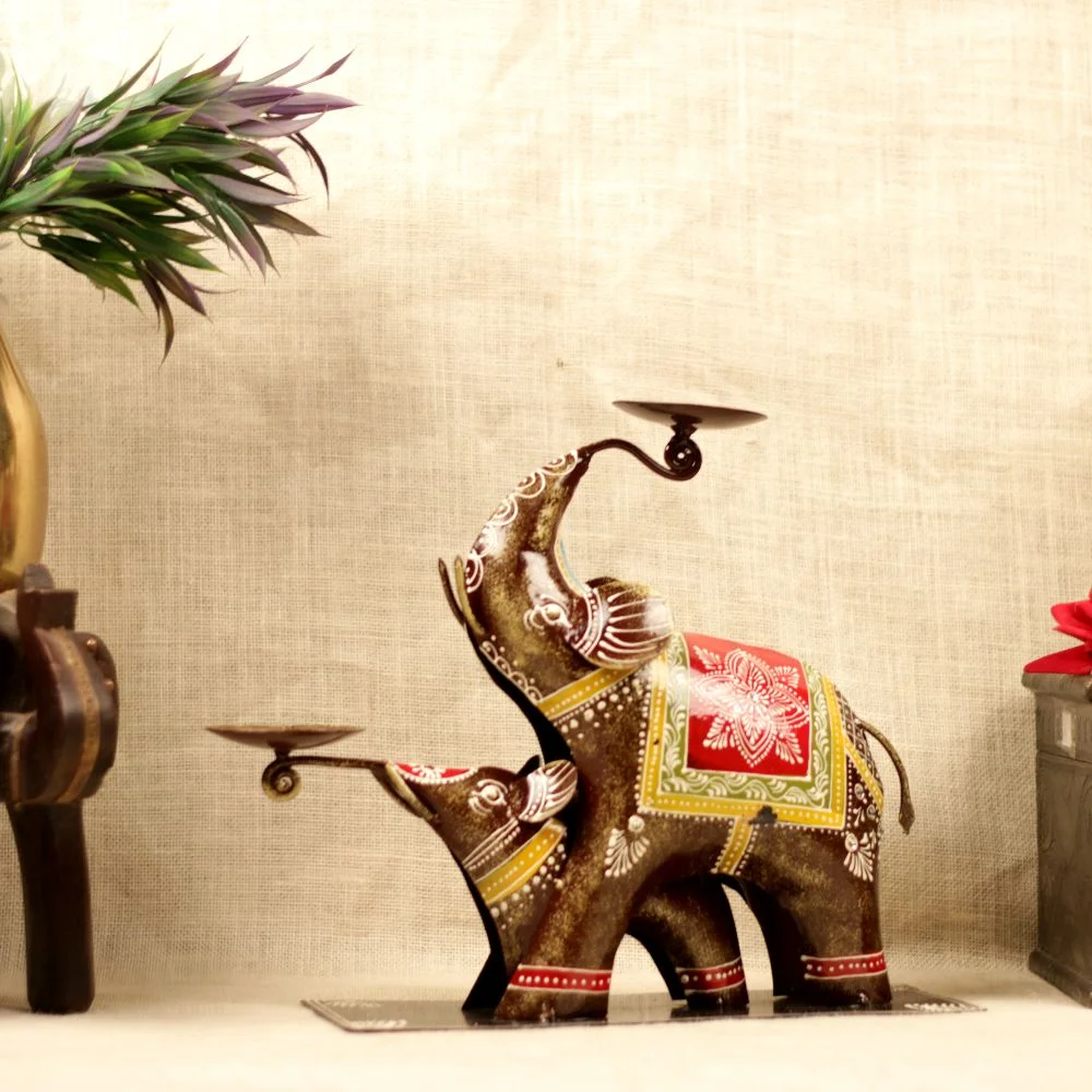 This is a beautifully handcrafted metal elephant candle holder set, featuring a mother elephant with her baby. Intricately painted with vibrant colors and ethnic patterns, this piece adds a touch of traditional elegance to any room. The elephants are designed to hold candles on their trunks, making it a unique and functional decor item. Perfect for festive occasions, gifting, or as a centerpiece for your home.